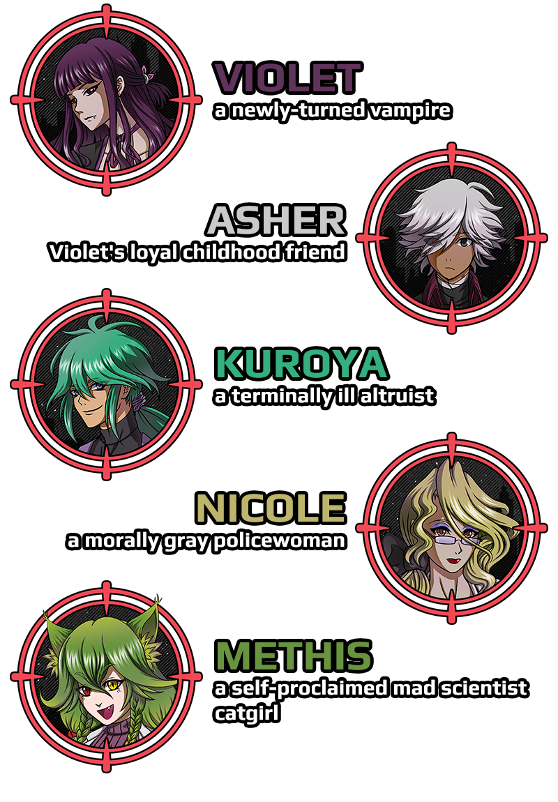 A newly-turned vampire, her loyal childhood friend, a terminally ill altruist, a morally gray policewoman, and a self-proclaimed mad scientist catgirl. Figure out how their fates intertwine in this standalone prologue to Red Crown Project, an upcoming sci-fi death game visual novel.